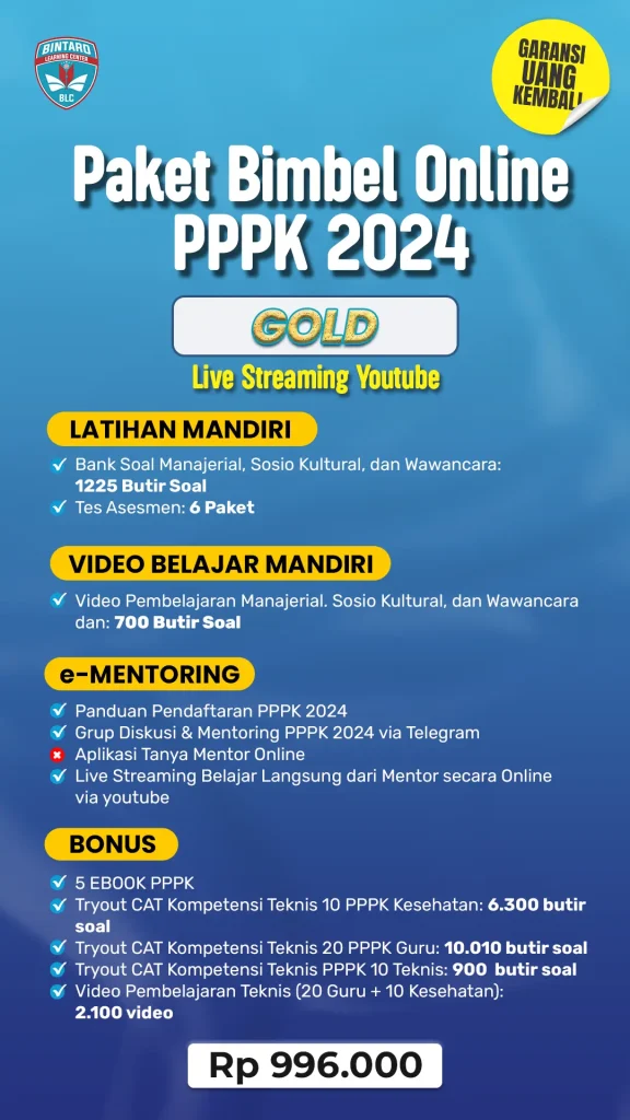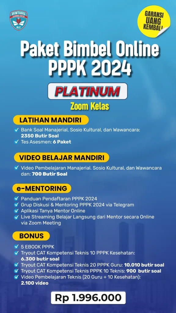 - Satu-satunya bimbingan belajar yang memberi Garansi 100% uang kembali jika tidak lulus PPPK 2023